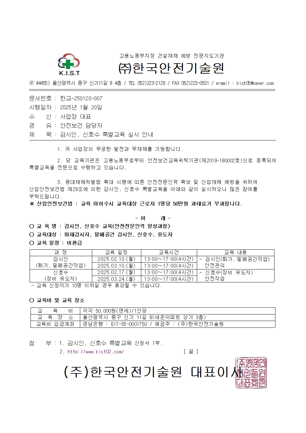 감시인, 신호수 특별교육 안내 공문 페이지 정보 작성일 24-06-12 15:24 본문 첨부파일 감시인, 신호수 특별교육 안내 공문10월,11월,12월.pdf (147.8K) 5회 다운로드 | DATE : 2025-09-17 14:39:10 목록 이전글감시인, 신호수 특별교육 신청서(양식) 24.06.13 다음글산업안전기사 자격증 취득반 모집 절차 및 신청 방법 안내 24.06.12