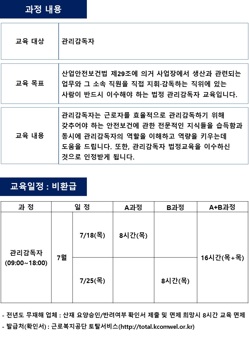관리감독자 교육(A+B과정 : 7.18,7.25)